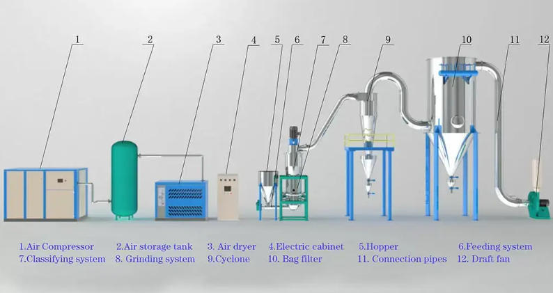 LHLジェットミルは,冷凍され,フィルタリングされ,乾燥した圧縮空気を利用し,圧縮室に注入された超音速空気の流れを形成し,材料を流動化します.加速粒子が複数のノズルの空気流の交差点で衝突する激しい衝突,摩擦,切断力によって超細質な粉砕を達成する.
